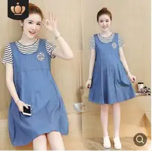 Buy Now Fake Two-piece Loose Large Size Maternity Dress 2019 Summer Fashion Denim Stitching Pregnancy Clothes for Pregnant Women QL529 before expired and You will save today
